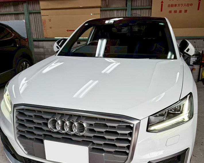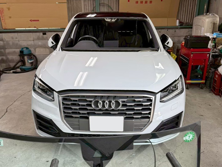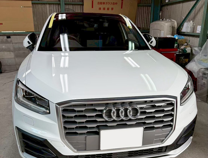 自動車ガラス交換、アウディ Q2 フロントガラス交換(純正ガラス)施工で入庫。