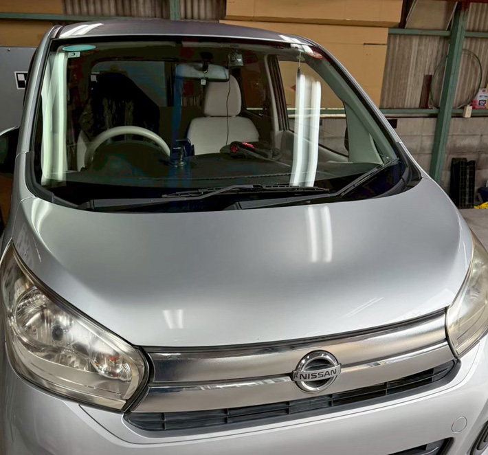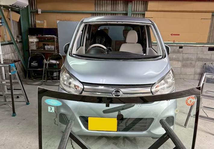 自動車ガラス交換、日産 デイズ フロントガラス交換(輸入ガラス)施工で入庫。