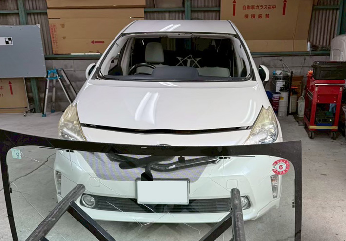 自動車ガラス交換、トヨタ プリウスα フロントガラス交換(輸入ガラス)施工で入庫。